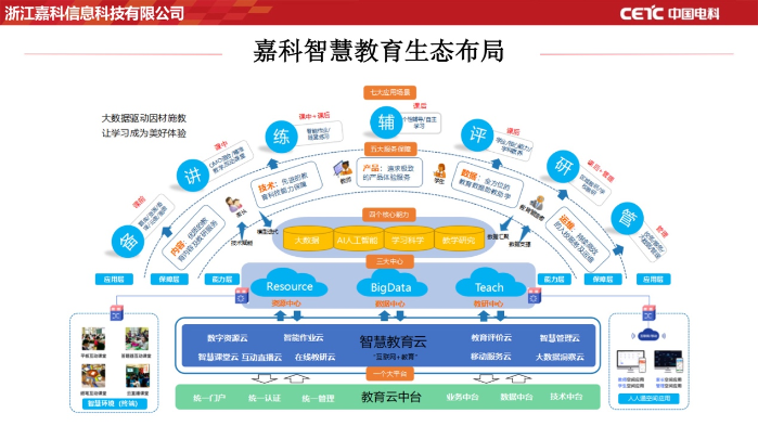 一个平台是指“互联网+教育信息化”云平台。该平台以优质的教育资源、真实的教研数据、创新的技术工具为基础,基于人工智能、大数据、物联网等技术手段,贯穿生态布局的众多业务场景,驱动高质量智慧教育云平台,助力基础教育数字化、现代化转型。